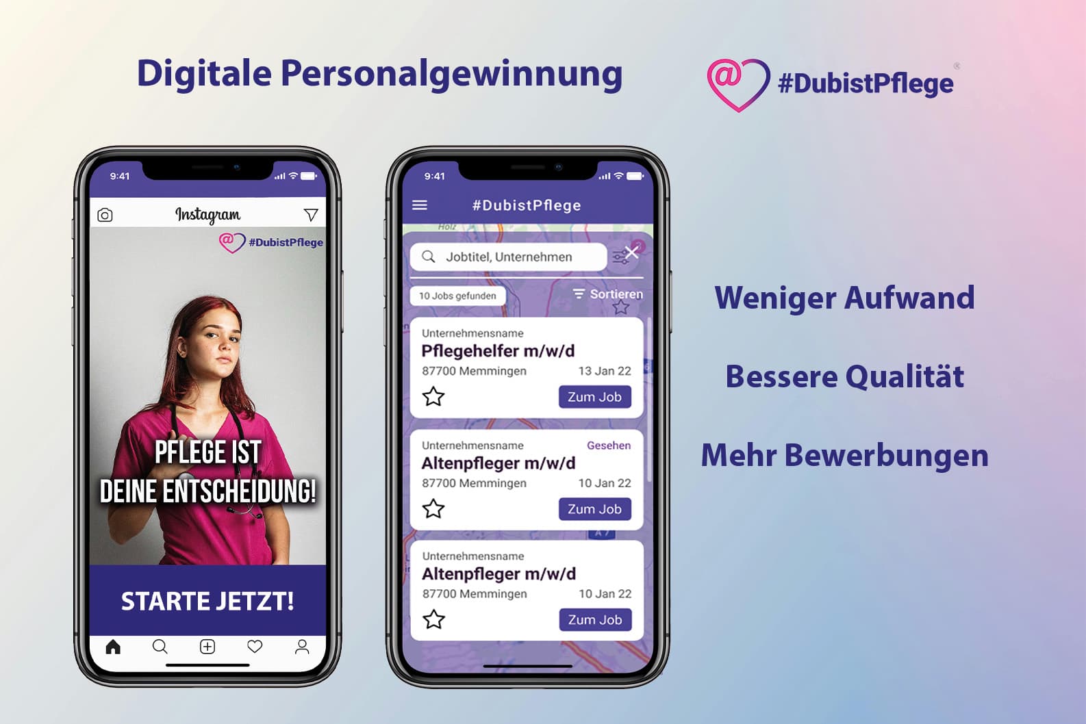 Klassische Stellenanzeigen erreichen nur einen Bruchteil der Pflegekräfte, da sie ausschließlich auf aktiv Suchende abzielen. Mit unserer emotionalen Social-Media-Kampagne für den Pflegeberuf sprechen wir auch abgewanderte Fachkräfte und latent Suchende gezielt an – eine große Zielgruppe, die bisher kaum erreicht wird.
