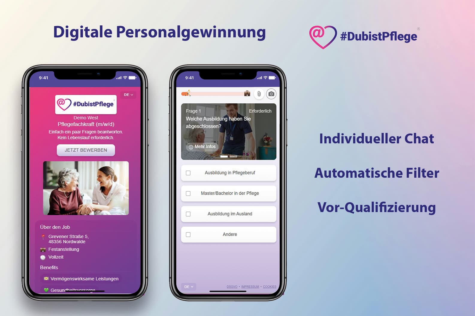 Unsere Kampagnen überzeugen mit einer starken Botschaft, einem nahtlosen Übergang zu den Jobangeboten und einem einfachen Bewerbungs-Chat, der zum Handeln motiviert. Dank moderner Recruiting-Technologie läuft die Teilnahme für Pflegeanbieter automatisiert und ohne zusätzlichen Aufwand. Alle Bewerbungen sind grundsätzlich passend, denn gesetzte Filter und KI-gesteuerte Validierung ...Produktexperte