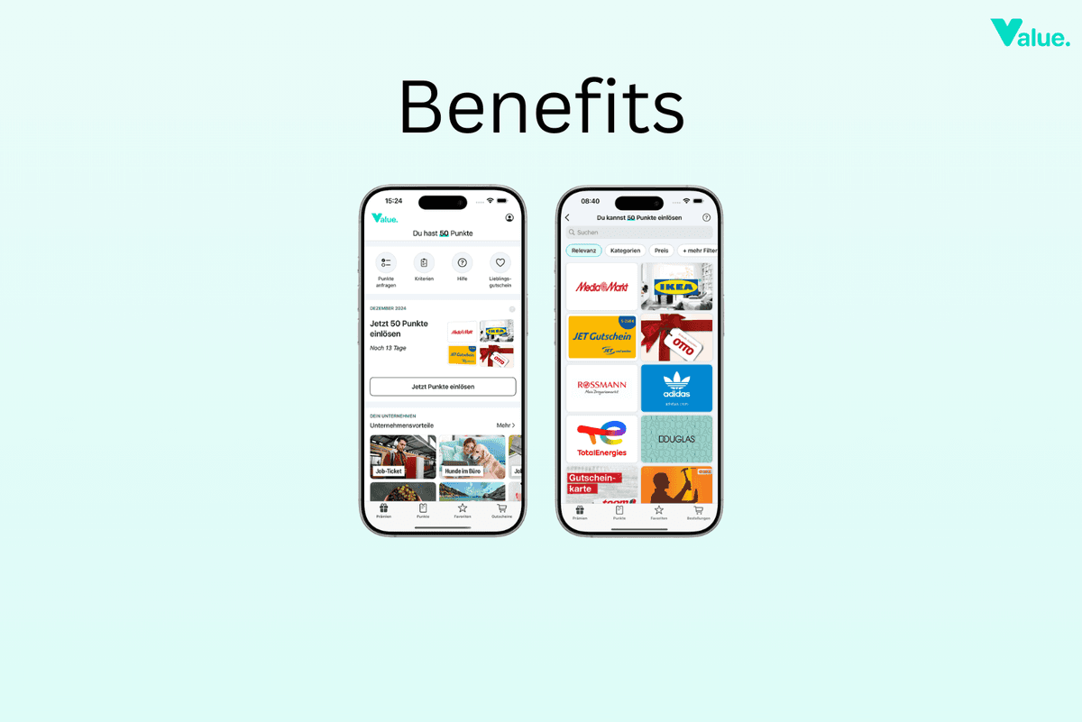 Bonussystem, Kommunikation, Befragungen, Gesundheit – mit Value alles in einer App.