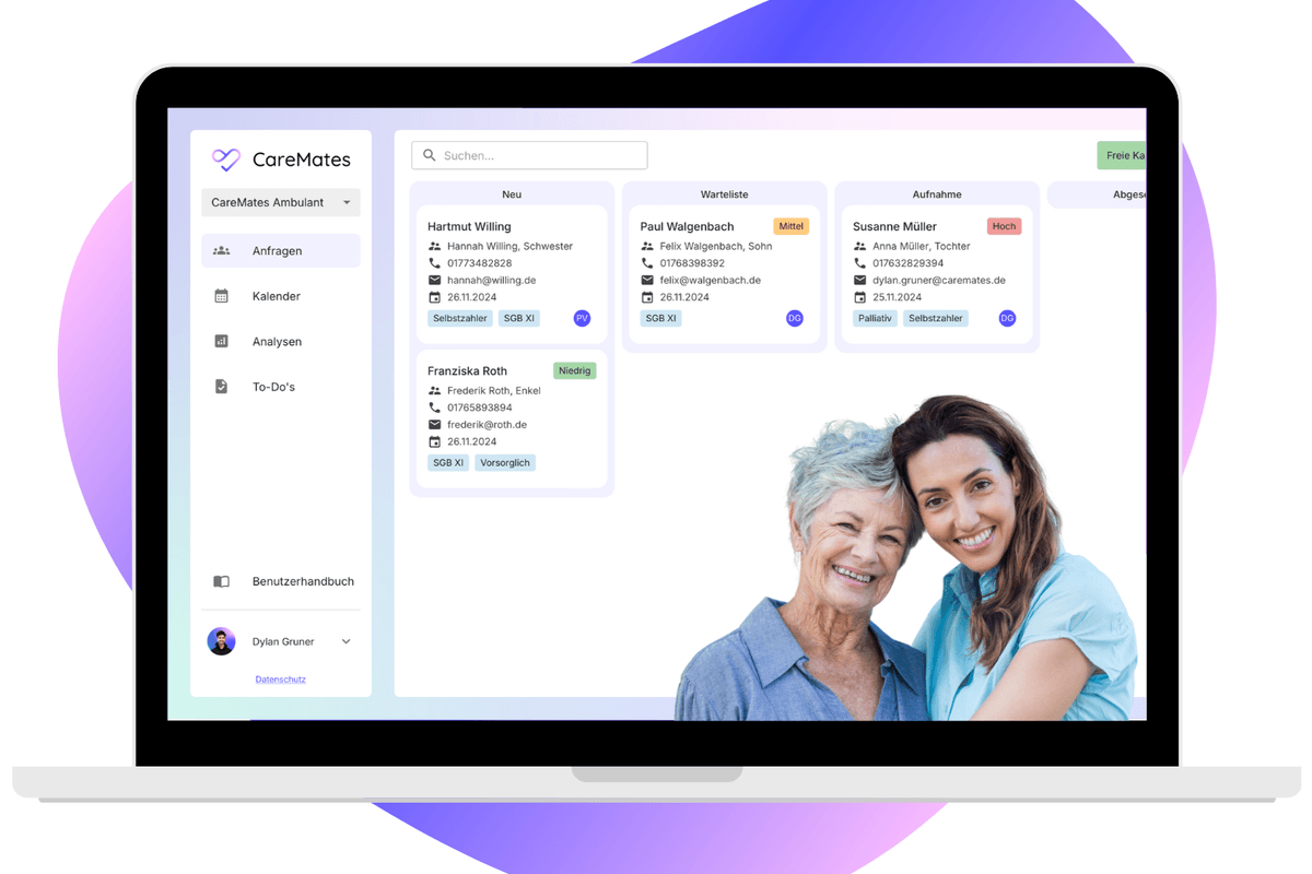 CareMates digitizes the admission and occupancy management process across elderly care, child and youth services, and disability support – GDPR- and KDG-compliant, flexible in its use, and saving up to 80% of time through structured, automated workflows. Developed in close collaboration with Caritas.