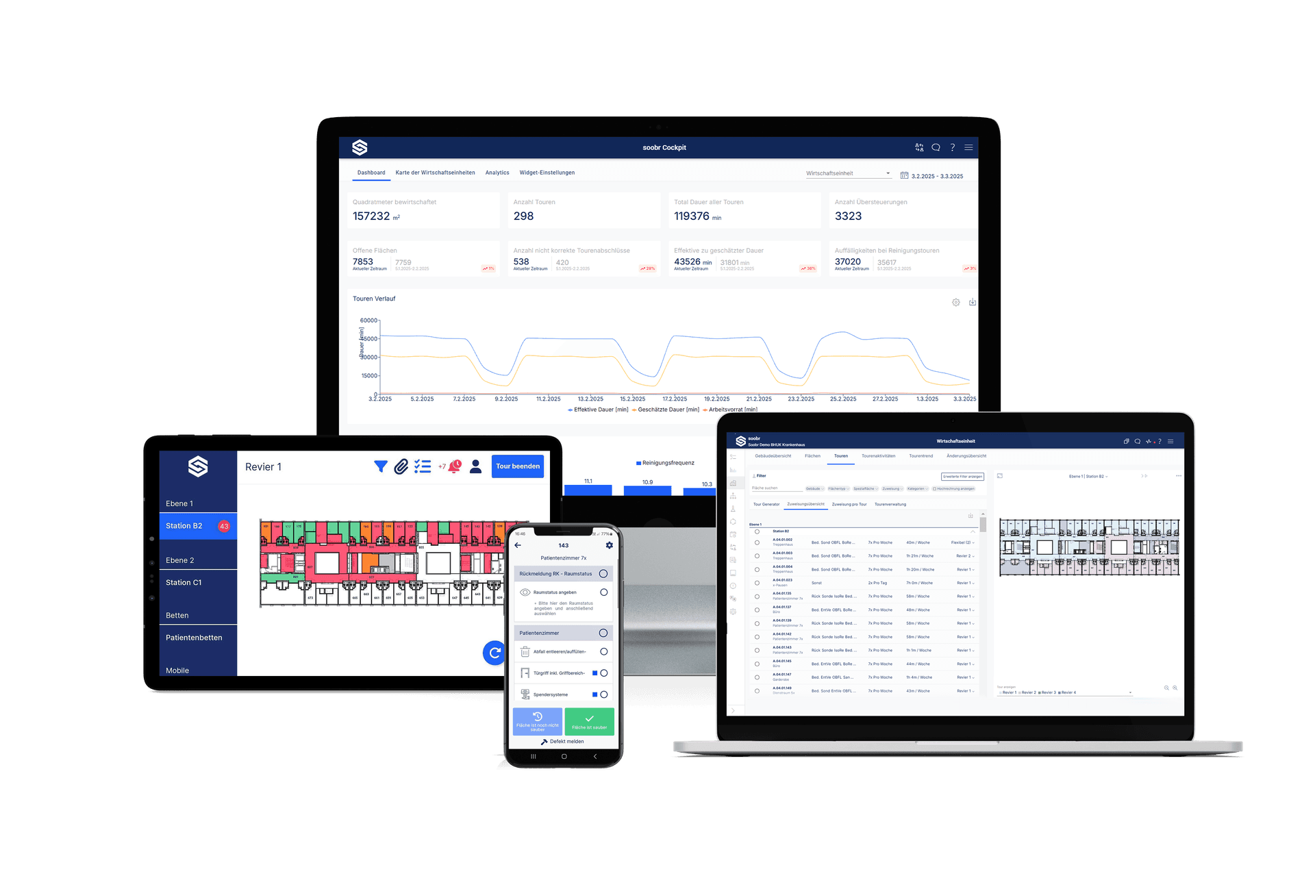 Soobr is the software for optimised and demand-oriented planning, execution, and control of cleaning services in the healthcare industry. With algorithmic and dynamic planning, soobr enables efficient and transparent cleaning processes that lead to cost savings and ensure performance documentation.